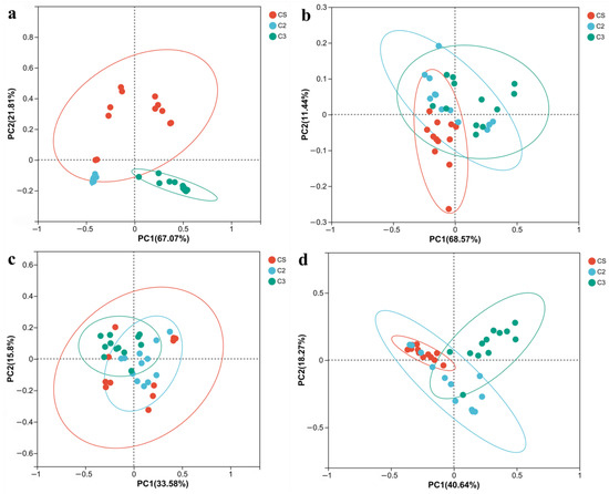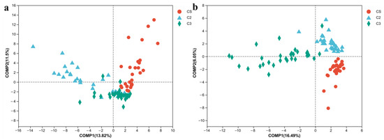 PLS-DA analysis of the microbial genera in the fermented grains during the sauce-flavor Baijiu manufacturing process. (a) bacteria. (b) fungi. CS, round 1b. C2, round 2. C3, round 3.
