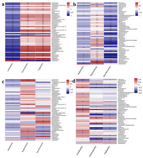 Reciprocal interaction analysis of the microorganisms in the fermented grains during the manufacturing process of sauce-flavor Baijiu. (a) the three dominant bacteria genera with other bacteria. (b) the three dominant fungi genera with other fungi. (c) the three dominant fungi genera with bacteria. (d) the three dominant bacteria genera with fungi. * 0.01 < p ≤ 0.05, ** 0.001 < p ≤ 0.01, *** p ≤ 0.001.