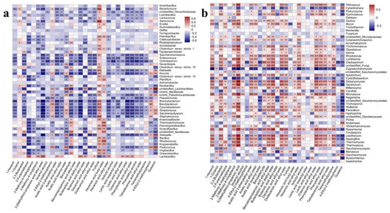 Correlation analysis of flavor chemicals and microbial community in the fermented grains of sauce-flavor Baijiu. Red represents a positive correlation, and blue represents a negative correlation. (a), bacteria with flavor chemicals. (b), fungi with flavor chemicals. * 0.01 < p ≤ 0.05, ** 0.001 < p ≤ 0.01, *** p ≤ 0.001.