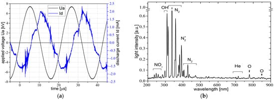 The electrical diagnosis of plasma was related to the applied voltage, discharge current, charge monitoring, and power/energy estimation. Typical voltage–current waveforms are depicted below in Figure 2a.