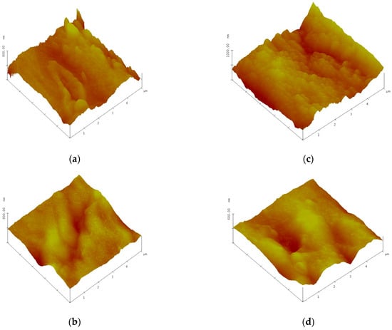 AFM 3D images of control wheat seeds (a,b) (‘Otilia’/’Dacic’) and plasma treated seeds (c,d) (‘Otilia’/’Dacic’); 5 × 5 µm2 scan size.