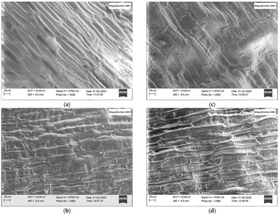 SEM images of control wheat seeds (a,b) (‘Otilia’/’Dacic’) and plasma-treated seeds (c,d) (‘Otilia’/’Dacic’); 500× magnification.