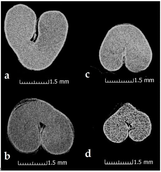 CT image images of control wheat seeds (a,b) (‘Dacic’/’Otilia’) and plasma-treated seeds (c,d) (‘Dacic’/’Otilia’).
