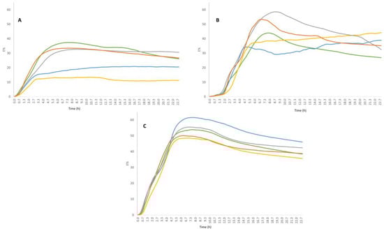 The BacTrac 4300® instrument, which was used to perform the impedometric analysis, allows the detection of bacterial activity in real time by measuring the decrease in impedance in an alternating current field. This is because during duplication, the viable cells of the bacteria break down sugars into smaller molecules that make the medium more conductive, resulting in a decrease in the total resistance and total impedance, which can thus be used as an indirect measure of bacterial metabolism [32]. During the incubation period, the instrument can register two specific impedance values for each individual measurement: (i) the conventional conductance (M value), which corresponds to the total medium impedance, and (ii) the capacitance value (E value), which is the measurement of the electrochemical double layer impedance near the electrodes. These two values, recorded simultaneously every 10 min and presented as relative changes compared to a baseline value, are expressed as M% and E% and visualised as a capacitance or conductance curve [31]. At the end of the analysis, all recorded capacitance data (E%) were used in three different ways: (i) to be fitted by the Gompertz equation to obtain the Rate and yEnd kinetic parameter, according to Bancalari et al. [30]; (ii) to build a graphical representation of the initial capacitance curve (Figure 1); (iii) to calculate the ΔE% parameter as an index of EPS production [32,33].