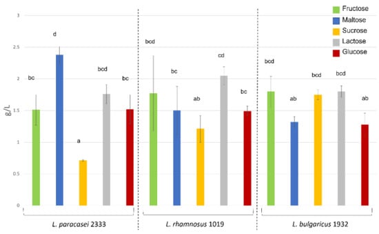 The ability of the strains to produce EPS was assessed by both impedometric analysis and the official gravimetric method. The E% value obtained from the impedometric analysis, which is the measure of the double-layer capacitance, was previously used by Bancalari and colleagues [32] to demonstrate the presence of released EPS during LAB growth [32]. The measured E% values were used to calculate the parameter ΔE%, which is the difference between the maximum E% value and the value recorded after 25 h of incubation (Table 1). In a previous work [33], strains causing a decrease in ∆E% value of more than 3, were assumed to be able to produce EPS. The data obtained by this method were compared with the gravimetric method normally used to quantify dietary fibre in complex samples. This method can achieve a higher degree of sample purification when used as an extraction method [36]. According to the impedometric method, L. bulgaricus 1932 was shown to be able to produce EPS from all sugars, with the highest peaks when fed with fructose and maltose and the lowest when fed with glucose (Table 1). The gravimetric method also showed no significant differences in the amounts of EPS for all sugars fed (Figure 2). L. paracasei 2333 analysed by impedometric method showed good EPS production in media containing fructose, lactose and glucose. On the other hand, EPS production was not observed in media containing sucrose and maltose as carbon sources (Table 1). Differently, using the gravimetric method, L. paracasei 2333 proved to be the best EPS producer when maltose was employed as carbon source, compared to the other two strains under the same conditions (Figure 2). However, when cultivated on sucrose, the significantly lowest amount of EPS was obtained for this strain. Moreover, a correlation can be observed between the quantification by gravimetric method and ∆E% for EPS production with the other three sugars, fructose, lactose, and glucose. The impedometric method showed that L. rhamnosus 1019 was only able to produce EPS when fed with fructose and glucose. However, the gravimetric method showed that the strain was able to produce EPS with any sugar, and the only significant difference was found in the experiments with lactose and sucrose, with the former resulting in a higher EPS content. The results obtained by the two methods agreed in 10 of 15 conditions tested. The greatest discrepancies were found when L. rhamnous 1019 was fed the disaccharides lactose, maltose, and sucrose, and when L. paracasei 2333 was fed with maltose and sucrose. The greatest agreements were highlighted for all strains when grown on fructose and glucose, and for L. bulgaricus 1932 under all conditions tested. These different results could be due to the different molecular composition of the EPS, which affects the electric measurement differently.