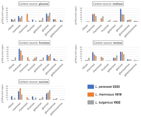 The monosaccharide composition of EPS produced by the three selected strains when fed with the five different sugars is shown in Figure 3. All three strains were able to produce EPS containing glucose, mannose, galactose, fructose, ribose, glucosamine and galactosamine as principal sugars. L. rhamnosus 1019 and L. bulgaricus 1932 produced EPS that also contained rhamnose, with L. rhamnosus 1019 able to incorporate this sugar into the EPS chain in amounts on average twice as large as the ones in EPS of L. bulgaricus 1932 (17.6% and 9%, respectively) when fed with all sugars except maltose. In contrast, L. paracasei 2333 was unable to incorporate rhamnose into the polysaccharide chain regardless of the carbon source with which it was fed, probably due to the absence of gene clusters encoding the production of this sugar [39]. Rhamnose was observed to be uncommon in EPS produced by lactobacilli in Zeidan et al. [14], which reports the presence of this sugar only for some strains of L. bulgaricus and L. rhamnosus, in agreement with our results. Apart from this marked difference, the other sugars were incorporated in all the EPS chains in similar, albeit variable, amounts. All three strains produced EPS consisting primarily of glucose and mannose, regardless of the carbon source added to the growth medium. The sum of mannose and glucose, expressed as a relative percentage of total sugars, ranged from 42% to 88%, with an average of 64%, suggesting that the EPS produced were mainly classifiable as glucomannans, despite the presence of other hexoses and pentoses [40,41,42]. Mannose seems to be present in high amounts when fructose was present as a carbon source, both as such and when present within sucrose chain. This might be supported by the fact that mannose and fructose are metabolically close, with only one metabolic step between them [43].