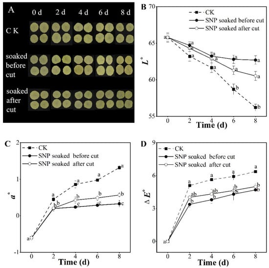Effect of SNP treatment on visual appearance (A) and color of L* (B), a* (C), and ΔE* (D) of fresh-cut potatoes. Different letters indicate significant differences among treatments at same storage time (p < 0.05).