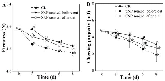 Effect of SNP treatment on texture of fresh-cut potatoes. Firmness (A) and chewing properties (B). Different letters indicate significant differences among treatments at same storage time (p < 0.05).
