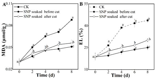 In summary, SNP treatment before cutting significantly delayed the increases in MDA and EL (p < 0.05) in this study (Figure 3), which are related to minor cell wall damage [].