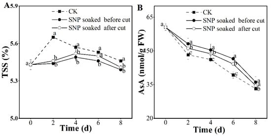 Effect of SNP treatment on nutritional properties of fresh-cut potatoes. TSSs (A) and AsA (B). Different letters indicate significant differences among treatments at same storage time (p < 0.05).