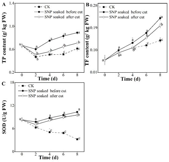 In this study, the TP and TF contents and SOD activity were selected to evaluate the antioxidant activity. The data in Figure 5 show that the potatoes that were treated with SNP before cutting had significantly enhanced TP and TF contents and SOD activity during storage (p < 0.05), which were related to their high antibrowning ability and ROS scavenging capacity [].