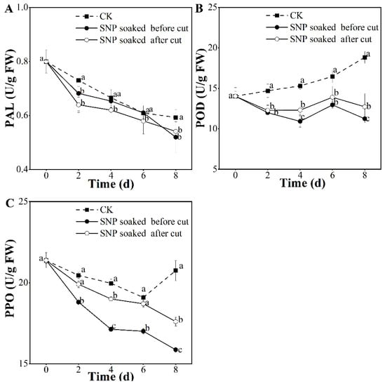 Effect of SNP treatment on enzyme activities PAL (A), POD (B), and PPO (C) of fresh-cut potatoes. Different letters indicate significant differences among treatments at same storage time (p < 0.05).