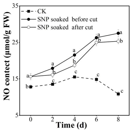 NO is a considerable donor, which is beneficial to maintain fruit storage quality. In this study, the NO content in potatoes treated with or without SNP increased from day zero to the fourth day, after which the potatoes in the SNP group displayed a continuous rise, while those in the control group showed an unfortunate decrease. It is clearly displayed in Figure 7 that the NO content in SNP groups was higher than that in the control group. Among the SNP groups, treatment before cutting produced results that were significantly superior to those of the other groups (p < 0.05). These NO data indicated that SNP enhanced the NO content, and SNP treatment before cutting was better. Similarly, treating blueberries with 0.1 mmol/L SNP for 10 min can boost the NO content to 3–5 μmol/g [], which is consistent with our current study viewpoint.