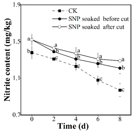 In this study, the nitrite content was used to evaluate the edible safety of fresh-cut potatoes treated with SNP. With the extension of storage time, the nitrite content in the fresh-cut potatoes treated with SNP before being cut was significantly lower than that in the potatoes treated with SNP after being cut (Figure 8). Additionally, the nitrite content in the untreated group was significantly lower than that in the remaining groups (p < 0.05), suggesting that SNP treatment induced nitrite accumulation slightly. However, it was noted in JECFA 2002 [] that the human acceptable daily intake (ADI) of nitrite is 0–0.07 mg/kg. This guideline indicated that the treatment applied in our study (immersing potatoes in 200 μmol/L SNP for 20 min) can be applied as a safe preservation technology in the fresh-cut potato industry.