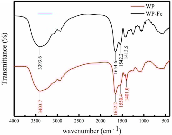 The change in the FTIR absorption peak can reflect the interaction between the ferrous ions and the organic group of the WP. We found that the absorption peaks of the WP and WP-Fe chelate were significantly different (Figure 1). At 3404 cm−1 was the strong absorption peak of -NH2. When SCP bound to iron ions, its strong absorption peak changed from 3404 cm−1 to 3394 cm−1. This result may be caused by the transition from the N-H bond to the Fe-N bond. The absorption band of WP at 1652 cm−1 was characterized as an amide I band. After binding with iron, the band corresponding to the amide I group moved to 1655 cm−1, which indicated that the C=O group may combine with Fe2+ to form C-O-Fe. Similarly, the characteristic peak of -COOH moved from 1401 cm−1 to 1414 cm−1 with the chelation reaction, which was directly correlated to the structure of -COO-Fe. All in all, after the walnut polypeptide was chelated with ferrous iron, the position of its characteristic absorption peak and the relative absorption intensity changed significantly, indicating that the polypeptide–ferrous chelate is a new substance unlike the polypeptide.