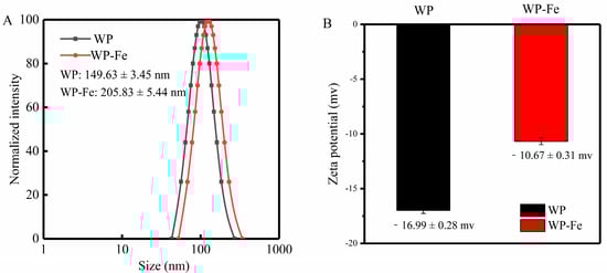 The particle size distribution curve is an important physical parameter for judging composite materials. The particle size distributions of WP and WP-Fe are shown in Figure 2A. It can be found in the figure that compared with the average particle size of WP of 149.63 ± 3.45 nm, the particle size range was 42.85–270.65 nm, the average particle size of the WP-Fe chelate was significantly increased (205.83 ± 5.44 nm), and the particle size range was 52.24–340.21 nm. The results showed that after the iron chelation reaction, the particle size of WP-Fe became larger. On one hand, this is because the ferrous ions change the spatial structure of the peptide chain. On the other hand, the addition of ferrous ions causes aggregation between peptide chains, that is, one ferrous ion binds two or more peptide chains at the same time, which is also the main reason for the increase in the particle size of the peptide chains. This is consistent with the results reported by Tian et al. [21], where a ferrous ion can bind to one or more peptide chains simultaneously. In addition, the polydispersity index (PDI) of the WP and WP-Fe chelate were 0.165 and 0.341, respectively, indicating a uniform and stable particle size distribution.
