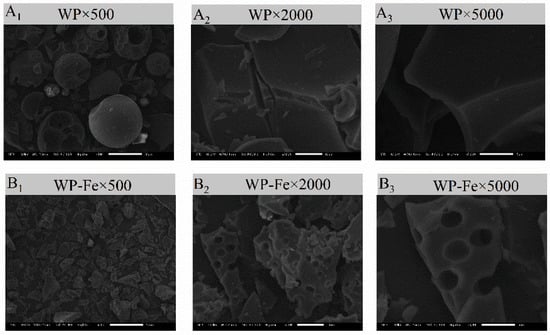 Microstructure of the WP (A) and WP-Fe chelate (B) determined by SEM.