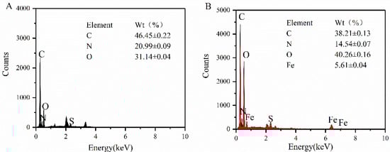 Elemental composition analysis of the WP (A) and WP-Fe chelate (B).