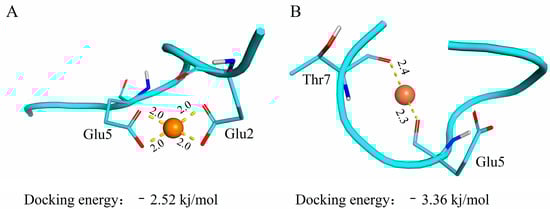 Figure 5A,B are the most reliable binding models established by the docking of GEHIEESR and HAVSEGTK with ferrous ions, respectively. It can be seen from the figure that the ferrous ion sites are Glu2, Glu5 and Glu5, Thr7, which also suggests that Glu is one of the main binding sites for ferrous ions. This result is consistent with the results of amino acid composition (Section 3.5). The molecular docking results of the decapeptide zinc chelate prepared by Fan et al. [35] showed that glutamic acid was one of the main amino acids for zinc binding. Subsequently, some studies have proven through molecular docking that the binding of Mytilus edulis osteogenic peptides to calcium ions is mainly due to the contribution of Glu [36,37]. The docking type of ferrous ion with GEHIEESR and HAVSEGTK has electrostatic interactions and metal acceptors. Electrostatic interactions play an important role in the binding of GEHIEESR to ferrous ions. The binding of HAVSEGTK to ferrous ions is as a metal receptor. This result is similar to that of the hydrophobic peptide zinc chelate in oysters [38].
