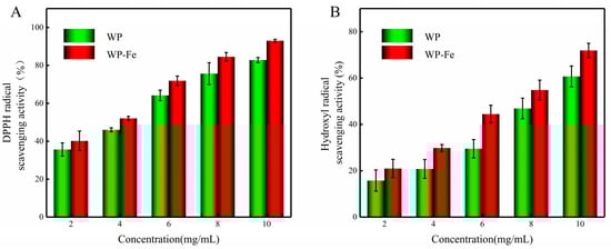 The antioxidant activities of the WP and WP–Fe. (A) DPPH radical scavenging activity and (B) hydroxyl radical scavenging activity.