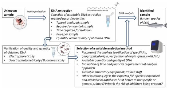 Various DNA-based methods are used for fish species identification. Although they are often based on different bases, their implementation includes several similar preparatory steps, such as DNA isolation and in silico analysis using available databases (e.g., designing specific primers). The general procedure is shown in Figure 1.