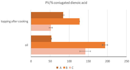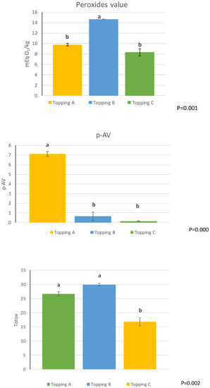 | PV (mEq O2/kg) | 5.94 ± 0.04 c | 17.85 ± 0.81 a | 11.29 ± 0.13 b | ** |