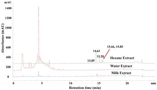 FBT is usually cooked with butter or milk. During the cooking process, some of the less polar constituents in FBT, which may have health benefits, could be extracted into the fat in milk or butter. Therefore, the reversed-phase HPLC profiles of water, milk, and hexane extracts were analyzed and compared. As shown in Figure 1, some less polar HPLC peaks with retention times of 13.85 min, 14.61 min, 15.20 min, 15.66 min, and 15.85 min were observed in the hexane extract, and to a lesser extent, in the milk extract, but not in the water extract. The results suggested that these low-polarity components might have been missed in previous studies focusing exclusively on the FBT water extracts.