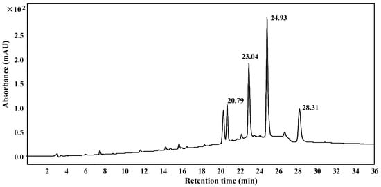 The lipophilic components presented in the milk/hexane extracts were more enriched in the hexane extract (Figure 1). Therefore, the hexane extract was further fractionated with reduced pressure silica gel chromatography, Sephadex LH-20 chromatography, and HPLC in order to isolate each compound contained in the peaks with retention times of 14.61 min, 15.20 min, 15.66 min, and 15.85 min (as in Figure 1) for structural studies. As shown in Figure 2, fractions containing the above peaks were further purified using reversed-phase HPLC with an Eclipse XDB-C8 column to yield compounds 1–4, with retention times of 20.79, 23.04, 24.93, 28.31 min, respectively.