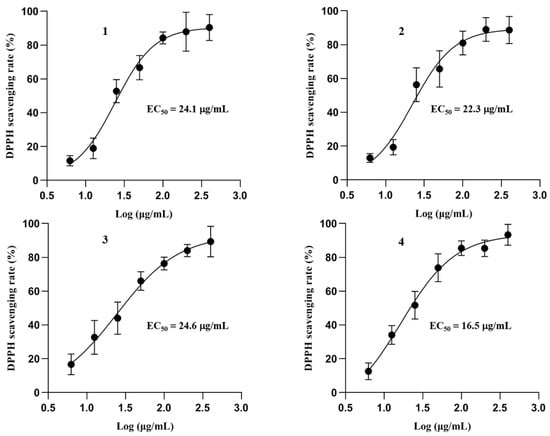 Antiradical activities of isolated phenol analogues 1–4. Dose-dependent antioxidant activities of compounds 1–4 were tested with DPPH radical scavenging assay. Data are presented as mean ± SD (n = 3).