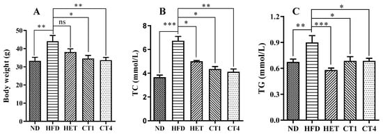 To investigate the effects of the FBT treatments on dyslipidemia in the HFD-fed mice, serum total cholesterol (TC) and triglyceride (TG) levels were evaluated. The serum TC level significantly increased from 3.66 ± 0.57 mmol/L in the ND group to 6.73 ± 1.16 mmol/L in the HFD group (p < 0.05, Figure 5B). Similarly, the serum TG levels were significantly elevated in the HFD group (0.90 ± 0.25 mM) compared to the ND control group (0.67 ± 0.11 mM) (p < 0.05, Figure 5B). Notably, after 8 weeks of treatment with HET, the TC and TG levels were decreased to 5.01 ± 0.20 mM and 0.58 ± 0.07 mM, respectively, both significantly different from the HFD positive control group (p < 0.05, Figure 5B,C). CT1 and CT4 were even more effective than HET in reducing the TC levels in the mice, bringing the serum TC levels to 4.12 ± 0.74 mM and 4.34 ± 0.66 mM, respectively (p < 0.05 compared to HFD group, Figure 5B). Both CT1 and CT4 treatments also led to a reduction of TG levels to 0.69 ± 0.16 mM and 0.69 ± 0.10 mM, respectively, significantly alleviating the high triglyceride levels caused by the high-fat diet (p < 0.05 compared to HFD group, Figure 5C).