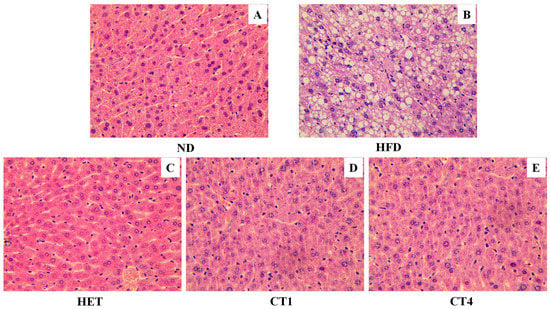 The effect of FBT hexane extract and isolated compounds on the accumulation of fat granules in the liver of C57BL/6N mice. (A) (ND): normal diet treated group; (B) (HFD): high-fat diet; (C) (HET): high-fat diet and hexane extract treated group; (D) (CT1): high-fat diet and compound 1 treated group; (E) (CT4): high-fat diet and compound 4 treated group.