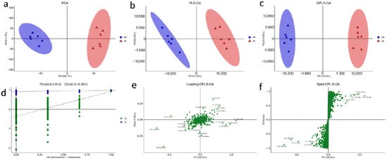 For the PCA (Figure 1a), the contribution rate of PC1 was 36.1%; the contribution rate of PC2 was 14.9%, and the cumulative contribution rate was 51%. For the PLS-DA (Figure 1b), the contribution rate of PC1 was 41.9%; the contribution rate of PC2 was 6.23%, and the cumulative contribution rate was 48.13%. For the OPLS-DA (Figure 1c), the contribution rate of PC1 was 40.6%; the contribution rate of PC2 was 7.35%, and the cumulative contribution rate was 47.95%. Colored ellipses represented 95% confidence intervals. The results show that the two groups of samples were gathered into two clusters. Through those analyses (Figure 1d–f), we obtained some important metabolites, such as carnosine, orciprenaline, PC (16:0/20:3(8Z,11Z,14Z)), and PC (18:1(11Z)/16:0). These metabolites were also screened out as differential metabolites by other methods later.
