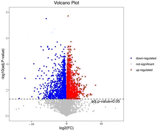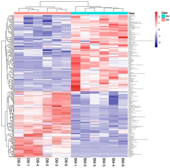 Through univariate statistical analysis of the data matrix, the volcanic map (Figure 2) showed the distribution of different metabolites in the two kinds of pigs. Red indicated that the content of metabolites in BM was significantly higher than that in DB, blue indicated that it was significantly less than that in DB, and gray indicated that the content of metabolites in the two kinds of pigs was not significantly different. These points represented different metabolites.
