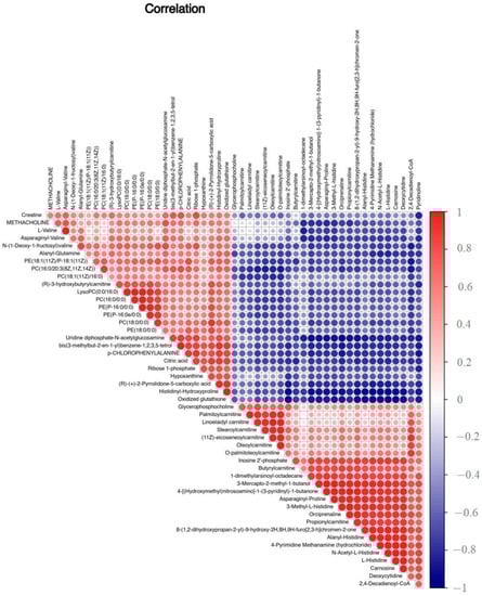 The original data obtained by LC-MS were processed by metabolomics processing software Progenesis QI v2.3 (Nonlinear Dynamics, Newcastle, UK) for baseline filtering, peak recognition, integration, retention time correction, peak alignment and normalization. Multivariate statistical analyses such as PCA, PLS-DA, and OPLS-DA were carried out on the processed data (Supplementary Material Table S1). Principal component analysis (PCA, Figure 1a) of metabolites could reflect the variability between and within sample groups, observe the overall distribution trend between samples, and judge the possible discrete points. The main parameter of the PCA model is R2X. The abscissa t [] and ordinate t [] of the PCA score map represent the score values projected on the principal components PC1 and PC2 of each sample, respectively. The projection score of each sample on the plane is composed of the first principal component and the second principal component, the spatial coordinate, which can intuitively reflect the similarity or difference between samples. If the difference between the two samples is significant, the two coordinate points are relatively far away on the score chart and vice versa. The prediction of sample categories was performed by PLS-DA (Figure 1b). Adding grouping variables to PLS-DA can make up for the shortcomings of the PCA method, and the parameter R2X (cum) can evaluate the effectiveness of the model. In addition to the parameter R2X (cum), PLS-DA also includes the interpretation rate R2Y (cum) and the prediction rate Q2 (cum). The closer the two are to one, the better the PLS-DA model can explain and predict the difference between the two groups of samples, representing the better prediction ability of the model (Figure 1d). OPLS-DA (Figure 1c) was used to filter out the noise irrelevant to the classification information, improve the analytical ability and effectiveness of the model, and maximize the differences between different groups within the model. The OPLA-DA score chart has two principal components: the predictive principal component and the orthogonal principal component. There is only one predictive principal component, while there can be multiple orthogonal principal components. OPLS-DA maximizes the difference between groups on t1, so it can directly distinguish the variation between groups from t1, while the orthogonal principal component reflects the variation within groups. There are significant differences between the two groups on the OPLS-DA score chart. In the loading OPLS DA diagram (Figure 1e), the closer the metabolic ions are to −1 and 1, the greater the concerns. The metabolites closer to the two corners in the Splot-OPLS-DA diagram (Figure 1f) are also important. Then univariate analysis was carried out to obtain the volcano map of metabolites. Finally, the metabolites were screened to obtain differential metabolites. Correlation analysis was carried out on these differential metabolites, and finally, the metabolic pathway and network diagram were analyzed.