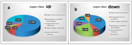 Statistical chart of upregulated (a) and downregulated differential metabolites (b).