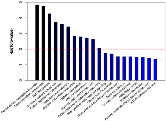 Metabolic pathway enrichment map (Top 20). The columns higher than the blue line mean p < 0.05, and the columns higher than the red line mean p < 0.01.
