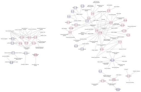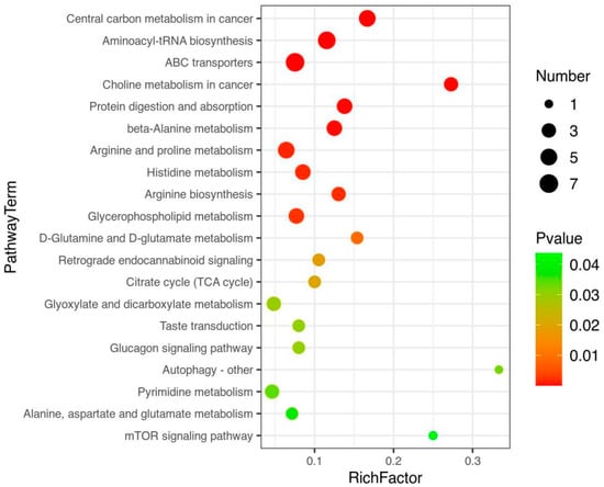 The KEGG database was used for the pathway enrichment of metabolites. We only focused on the analysis of differential metabolites that can be enriched into the metabolic pathway. There are 41 differential metabolites that can be enriched in the metabolic pathway, of which 26 are upregulated in BM (Figure 5a and Table 1), and 15 are downregulated (Figure 5b and Table 2). According to classification statistics, more than half of the metabolites are organic acids, such as amino acids (3-methyl-l-histidine, 4-hydroxyproline and their derivatives). In the aminoacyl-tRNA biosynthesis pathway of BM, the expression of histidine was downregulated, and the expression of arginine, glutamine, lysine, proline and valine was increased; In the ABC transporters pathway, as in the previous pathway, the expression of 4-hydroxyproline and taurine were also upregulated. We calculated statistics on differential metabolites. The following figure shows the classification of metabolites that could be enriched to the KEGG pathway. In addition, we also made statistics on other differential metabolites, mainly lipids and lipid molecules, organic acids and their derivatives, as well as some unclassified metabolites. Through the pathway enrichment diagram (Figure 6) and bubble diagram (Figure 7), we found 11 signal pathways with highly significant differences. Most of the other metabolic pathways are related to the biosynthesis of various amino acids, such as glycine, threonine, and leucine. We noticed that there were 11 signal pathways with significant differences. Finally, we used the network diagram to make a network diagram of metabolic pathways and corresponding metabolites (Figure 8), which can further clarify the relationship between different metabolites and metabolic pathways.
