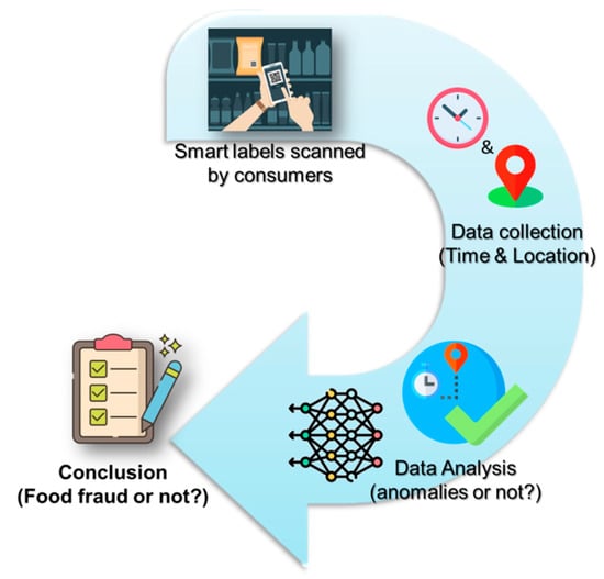 In this regard, some publications have suggested their use for following products en route and in some cases in detecting one type of food fraud, such as counterfeiting, e.g., for the fraud detection of champagne [35]. However, there has been limited use of the spatial-temporal information for the purpose of crime detection, with only a few studies demonstrating its potential (Section 3.2). It is probable that the use of spatial-temporal data analysis to detect food fraud has not expanded due to several challenges. Firstly, most food companies have been not fully aware of the potential of the spatial-temporal information about consumer scanning of the smart labels to detect food fraud. At present, there are few articles or reports illustrating the feasibility of the spatial-temporal information in fraud detection. Secondly, a system for capturing and storing the spatial-temporal data needs to be generated. As smart tags are usually printed on food packaging and scanned by different consumers at different times and places, it is necessary to have software available that is capable of processing this data online to provide a quick response on the status of the product for this complex situation [36]. Lastly, there is always a cost/benefit balance aspect, and there is some question as to whether it is worth it to invest in these systems and whether they will they result in sufficient benefits.