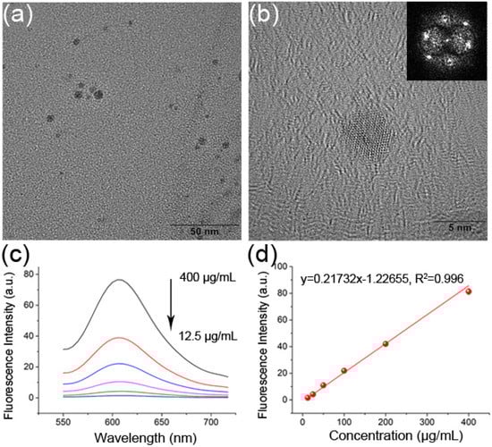 Characterization of GSH-CdTe QDs. TEM images (a) and HR-TEM image (Insert: Fourier diffractogram image) (b) of GSH-CdTe QDs. Fluorescence spectroscopy (c) and the linear relationship between emission fluorescence intensity at 615 nm (d) versus 12.5–400 μg/mL of GSH-CdTe QDs.