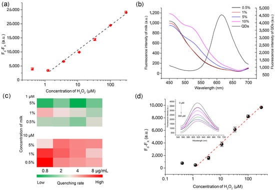 The fluorescence of GSH-CdTe QDs was quenched in H2O2 (Figure S2), which was speculated to be caused by the oxidation of the QDs by the strongly oxidizing H2O2 leading to the generation of new defects on their surface, thus increasing the non-radiative transition, which in turn reduced the generation of fluorescence in the excitonic state, leading to fluorescence quenching []. It can be seen from Figure 2a that the fluorescence intensity gradually decreased with the increase of H2O2 concentration in a logarithmic trend rather than a linear trend, indicating that the quenching of the fluorescence of QDs was achieved through complex multivariate interactions. For the detection of H2O2 in water, the linear range was 1.23–300 μM of H2O2 with an LOD of 0.61 μM (S/N = 3). H2O2 is often used as a bactericide and other food processing aids in the production of milk and dairy products. However, milk has obvious fluorescence in the visible light range due to its complex composition. To verify the feasibility of GSH-CdTe QDs to detect H2O2 in milk, the interference of milk samples on QDs fluorescence was first evaluated (Figure 2b). The fluorescence intensity of milk decreased gradually in the range of 450–650 nm and was negligible at 615 nm, the maximum emission wavelength of GSH-CdTe QDs. Therefore, milk hardly interferes with the GSH-CdTe QDs fluorescence signal. In addition, the selectivity of the GSH-CdTe QDs was evaluated to exclude possible interferences in milk samples (Figure S3). The fluorescence values of GSH-CdTe QDs were reduced when the content of κ-casein and BSA was at 1%, but considering the large dilution factor of milk and milk powder in the assay, proteins such as κ-casein can not cause significant effects. Other than that, other interferents did not cause a decrease in the fluorescence of GSH-CdTe QDs. Therefore, the probe was considered suitable for the detection of H2O2 in milk. Furthermore, the checkerboard assay was used to evaluate the optimal operating conditions of GSH-CdTe QDs for the detection of H2O2 in milk (n = 3) (Figure 2c). The results showed that 1% milk solution containing 0.8 μg/mL GSH-CdTe QDs had the best detection efficiency and sensitivity. Under the above working conditions, the detection method of H2O2 in milk was constructed (Figure 2d), and the linear range was 1.23–300 μM of H2O2 with the LOD of 0.68 μM (S/N = 3).
