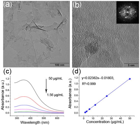 Characterization of MnO2 NSs. TEM images (a) and HR-TEM image (Insert: Fourier diffractogram image) (b) of MnO2 NSs; UV-Vis spectroscopy (c) and the linear relationship between Absorbance at 365 nm (d) versus 1.56–50 μg/mL of MnO2 NSs.
