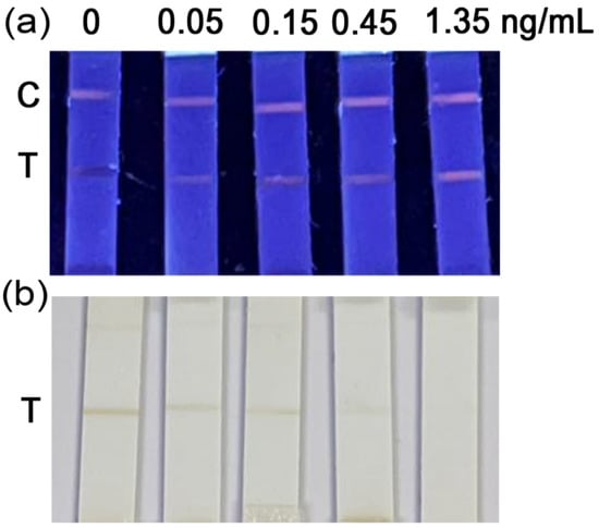 During the working process of FQISs, the type of buffer was found to have significant impacts on the chromatography of MnO2 NSs (Figure S6). The MnO2-Ab probe aggregated in ionic buffers (PBS, PBST, NaCO3-NaHCO3 buffer) and could not be chromatographed on the NC membrane. However, it smoothly passed through the NC membrane and bound with the antigen at the T line in non-ionic buffers (MES, HEPES). It was guessed that the ionic solution destroyed the surface electronic environment of MnO2 NSs, leading to the aggregation of MnO2 NSs during the chromatography. The HEPES buffer (20 mM, Figure S7) was used for the establishment of FQISs, which was found to be more suitable for probe chromatography and antigen-antibody binding. Totals of 0, 0.05, 0.15, 0.45, and 1.35 ng/mL of ENR standards solution were mixed with 10 μL of MnO2-Ab probe and added to the sample pad, after 5 min of chromatography, the detection results were observed (Figure 5). Under a UV lamp (Figure 4a), the MnO2-Ab probe was enough for quenching the fluorescence of the T line when detecting ENR free solution. However, when detecting 0.05 ng/mL of ENR, some of the MnO2-Ab probes were bound by ENR, and the remaining probes were not enough to quench all the fluorescence at the T line, so the fluorescence appeared. Thus, the LOD of these FQISs was 0.05 ng/mL of ENR in the HEPES buffer. However, the brown strip on the T line disappeared under the sunlight until the concentration of ERN reached 1.35 ng/mL (Figure 4b).