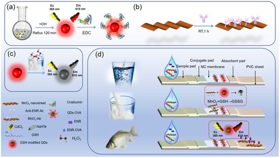 Nanosheets are a novel class of nanomaterials, which have been widely used in the fields of nanotechnology and nanomaterials []. Layered manganese dioxide nanosheets (MnO2 NSs) with high degrees of freedom are an important 2D layered functional material, which has attracted much attention due to its excellent optical properties and adsorption properties while retaining oxidative properties []. Based on the unique characteristics of GSH, water-soluble CdTe QDs with GSH as the ligand (GSH-CdTe QDs) were synthesized by hydrothermal method as the fluorescence signal probe. Firstly, an H2O2 detection method based on GSH-CdTe QDs was established for the highly sensitive detection of H2O2 in milk. In addition, a novel MnO2 NSs/GSH-CDTE QDs fluorescence quenching sensing system was constructed by coupling the detection antibody to the surface of MnO2 NSs as a sensing probe. Combined with the immunochromatographic analysis platform, a novel fluorescence quench immunosensor (FQISs) with strong anti-interference ability and high sensing sensitivity were constructed for the detection of ENR, and it is expected to be used for the detection and analysis of more trace hazards in food.