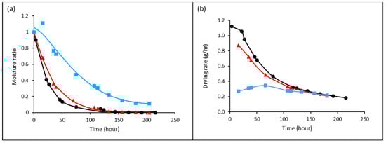 Thin-layer drying kinetic model (line) is well fitted to the experimental data of the moisture ratio of jaboticaba berries pretreated with 70% sugar (▲) and 10% salt (■) compared to berries without any pretreatment (●). (a) The degradation of moisture ratio with drying time and (b) The drying rate of jaboticaba berries with time.