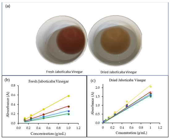 (a) Picture of jaboticaba vinegar fermented from fresh and dried berries, (b) absorbance of fresh jaboticaba vinegar at different concentrations and different wavelengths, and (c) absorbance of dried jaboticaba vinegar at different concentrations and different wavelengths. Yellow line denotes 430 nm, red line denotes 520 nm, blue line denotes 520 nm, and green line denotes 620 nm.