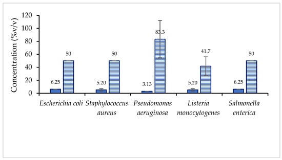 Minimum inhibition concentration of vinegar samples prepared from fresh (solid bar) and dried (line bar) jaboticaba berries.