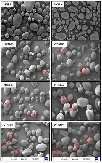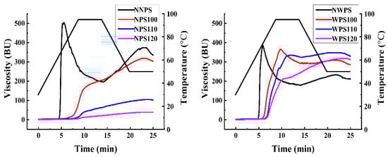 The viscograph was used to determine the pasting properties of starches. Temperature significantly affects the paste properties. The pasting temperature of the two processed starches increased compared to the native samples (Figure 5). As a result, HMT either strengthened the interaction between starch molecules or increased the thermostability of starch. The property changes after HMT were ascribed to the association between the chains of the amorphous region of the granules and the changes in crystallinity during the thermal process []. After HMT at different temperatures, the pasting temperature gradually increased at a higher treatment temperature, indicating that the starch granules were more resistant to swelling []. The peak viscosity, breakdown, and setback values were lower than the native starch, while the heat stability and starch shearing improved significantly. The HMT temperature was positively correlated with this decline []. In the same HMT conditions, the changes in the viscosity characteristics of WPS were smaller than that of NPS. This was mainly due to a lack of amylose in the waxy granules. WPS have less chance of forming a stable, dense double helix than NPS during HMT [].