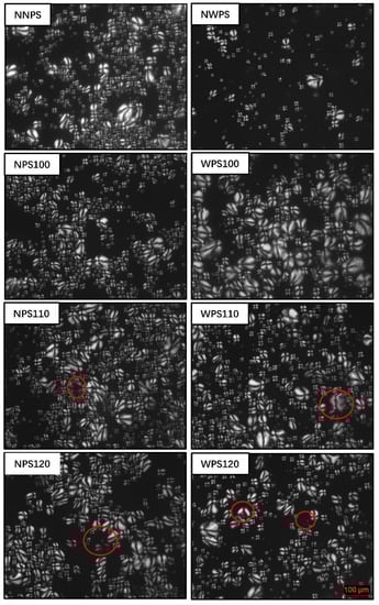 Polarized light microscopy of the samples (200×) (Red circles were indicated change in light refracted by the particles).