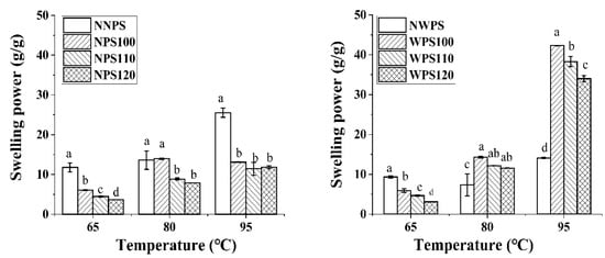 The swelling power of the samples. Different letters in a histogram signify significant differences (p < 0.05).
