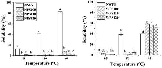 The solubility of the samples. Different letters in a histogram signify significant differences (p < 0.05).